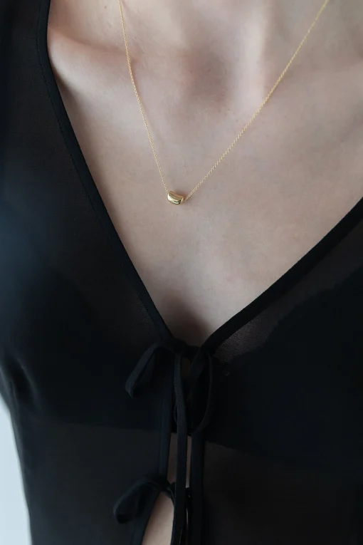 18″ length. Rolo chain. Bean pendant. Plated with 14k gold/silver. 2″ extender chain. Lobster clasp.
