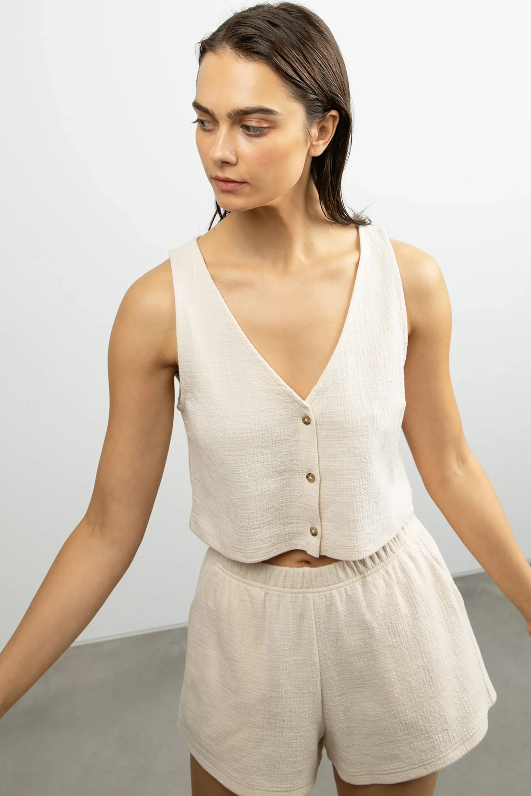 You loved our best-selling loungewear set so much we had to make an option for the warmer months. Cut from the same comfortable textured fabric, this button front tank is made in a relaxed fit and cropped length. You can wear it with the matching Elastic Waist Pant (PT-8065-W) or Elastic Waist Short (SH-12238-W).
