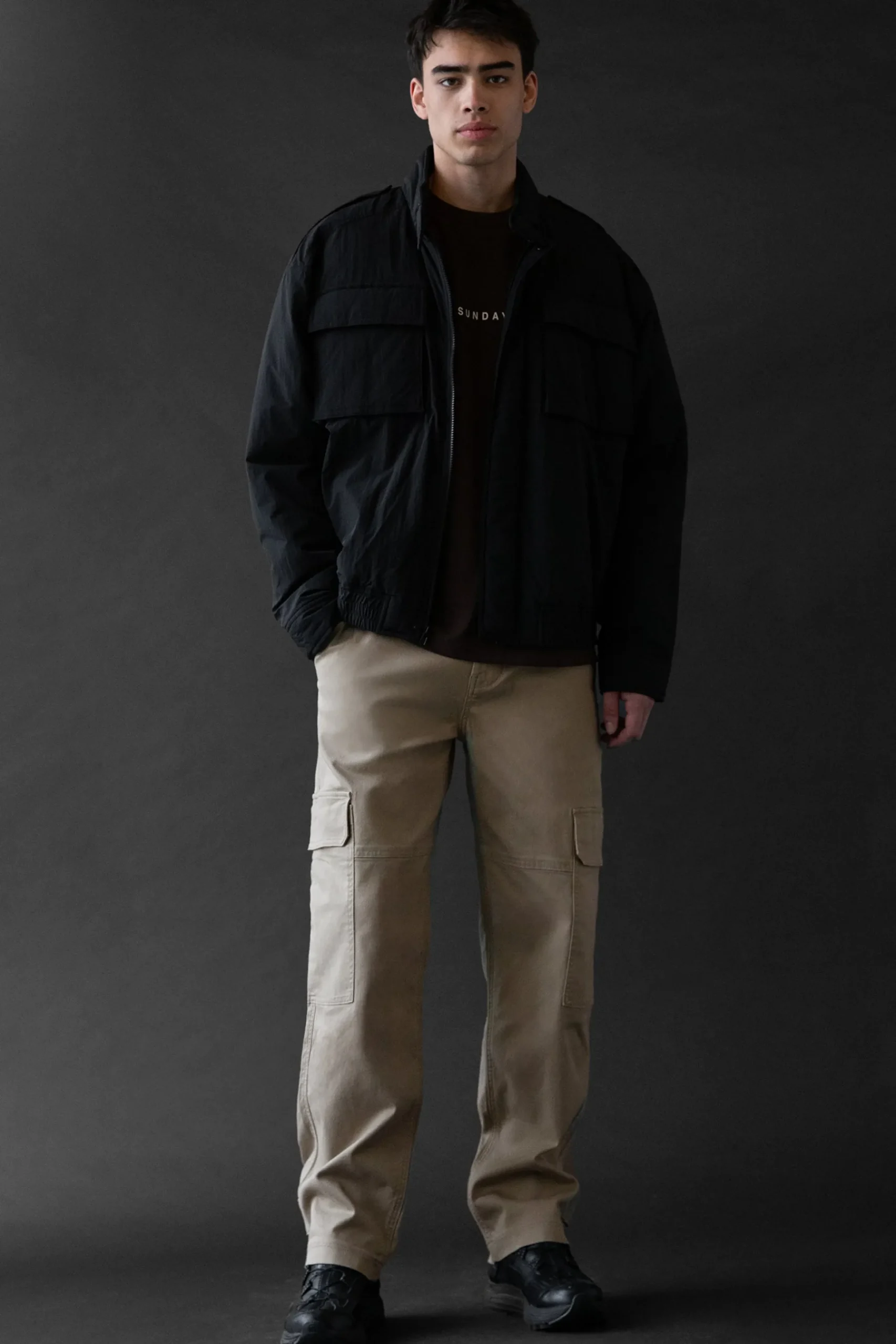 Relaxed fit. Mid-rise waist. Straight leg. Cotton twill. Large cargo pockets. Side pockets and back welt pockets. Adjustable tabs at hem to cinch. Belt loop. 30″ based on size M.