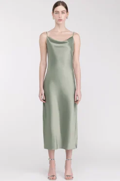 This satin midi dress is made in a slim fit, bias cut that drapes perfectly and is designed with a simple cowl neckline. The perfect dress for any season, style it for the holidays with a faux fur jacket or with strappy heels in the summer time.