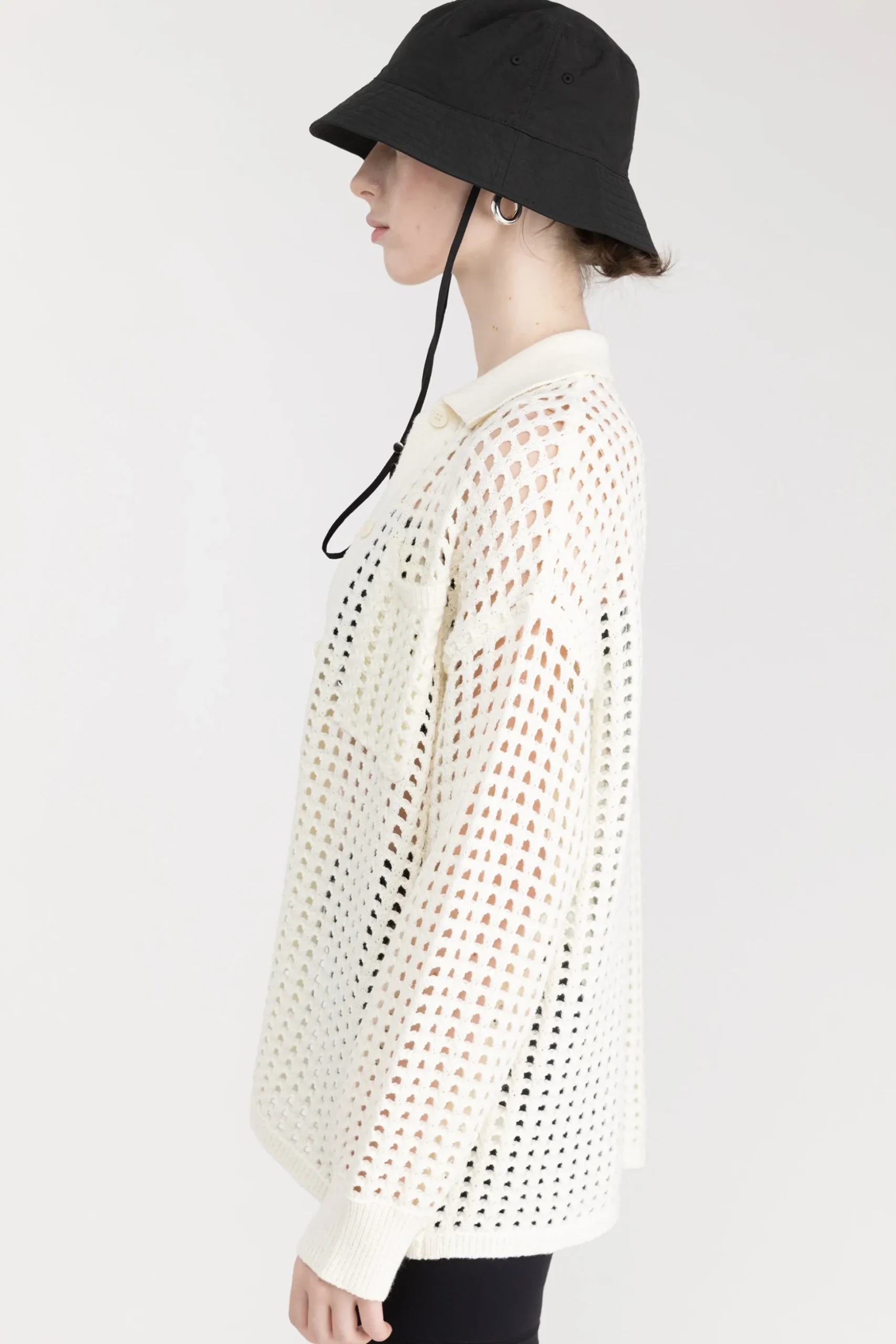 Crochet knit. Button-up design. Flared sleeves. Collared neckline.