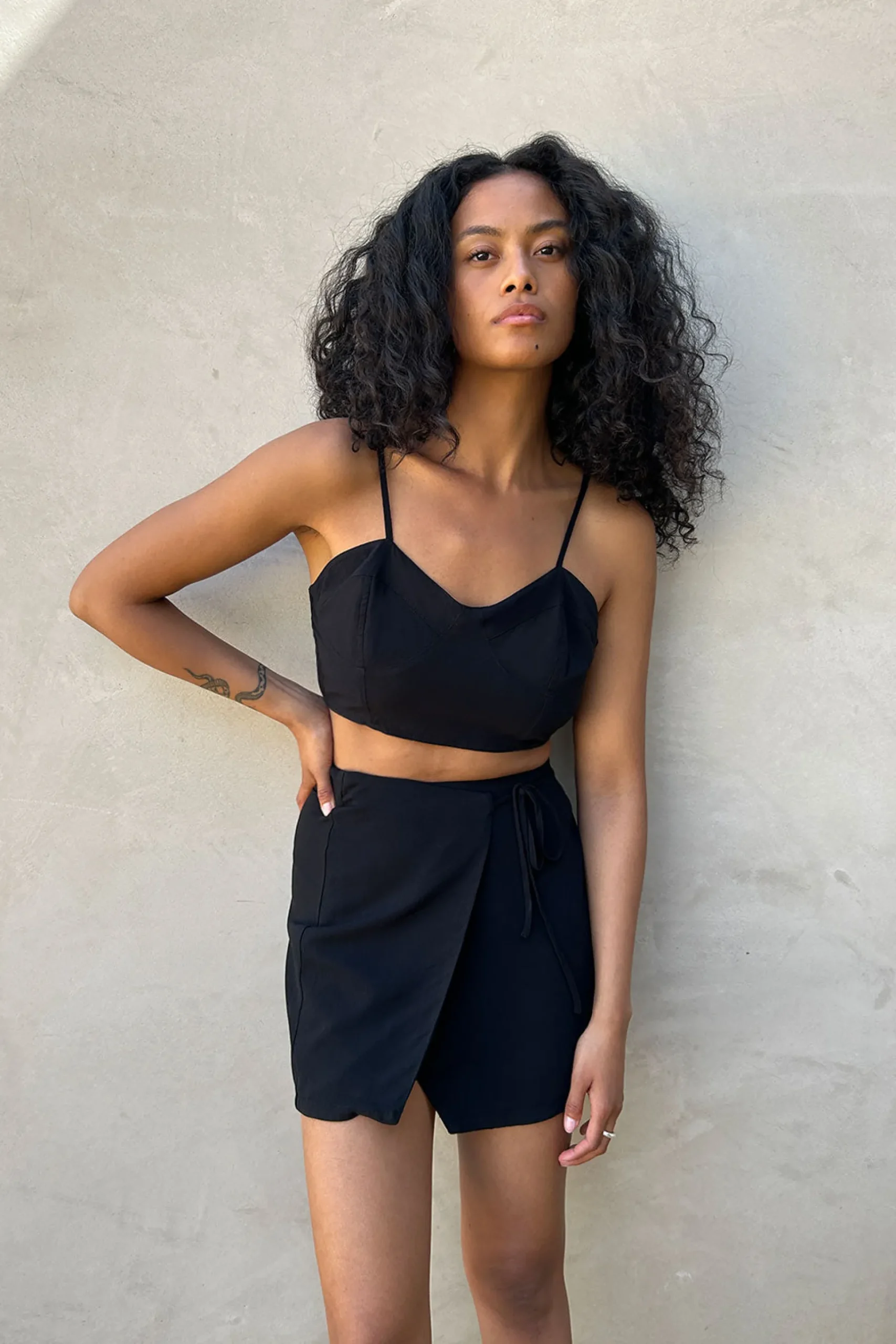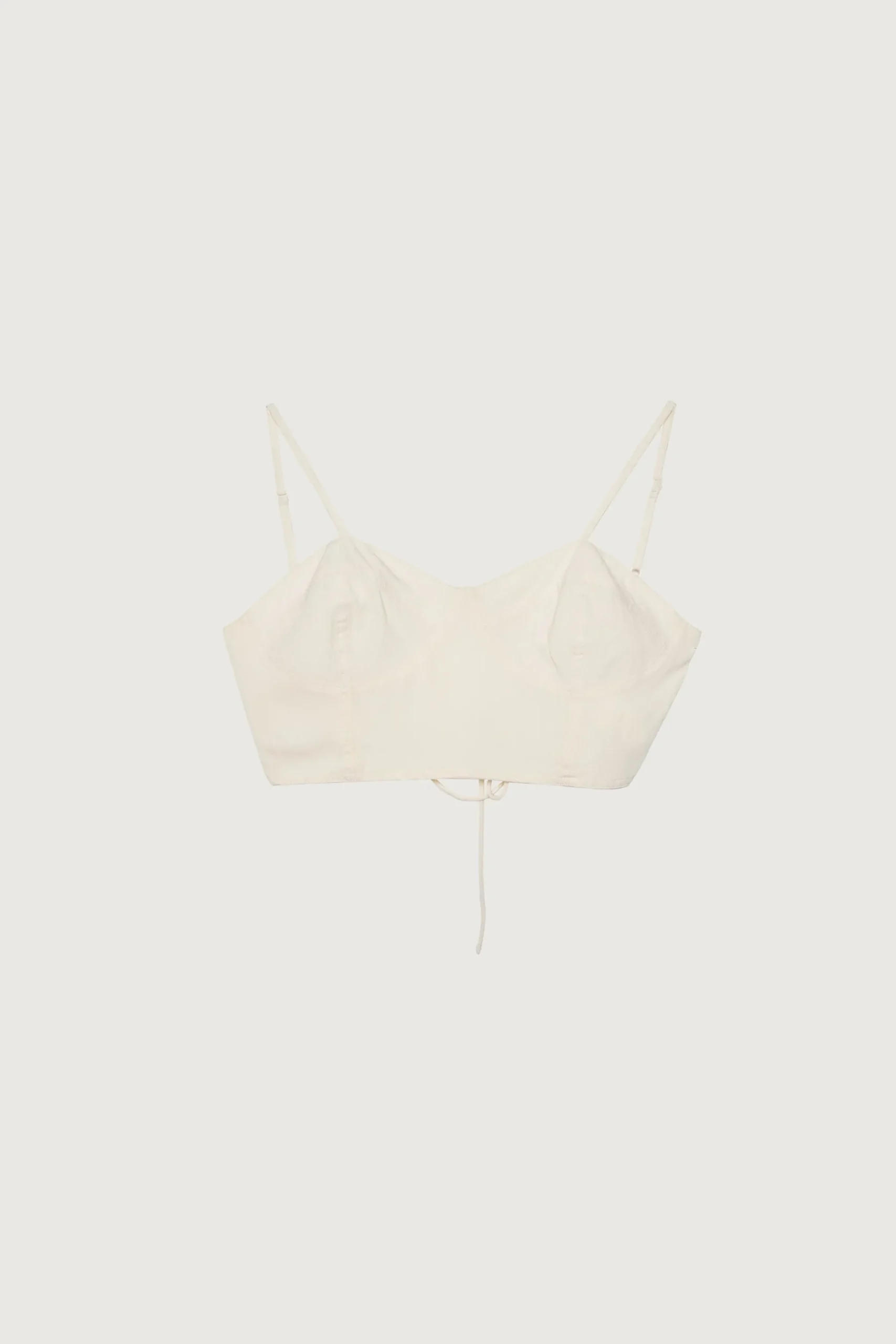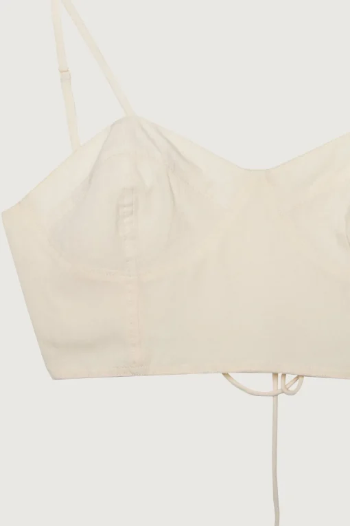 Classic fit. Cropped length. Bustier design. Side zipper. Open back with ties. 8.5″ length based on size S.