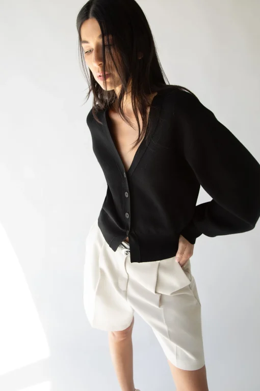 This cropped cardigan is lightweight and made in a relaxed fit for easy layering. It has ribbed trims, a button front and and semi-slouchy sleeves. Wear it with a slip dress or layer it over a basic tank.