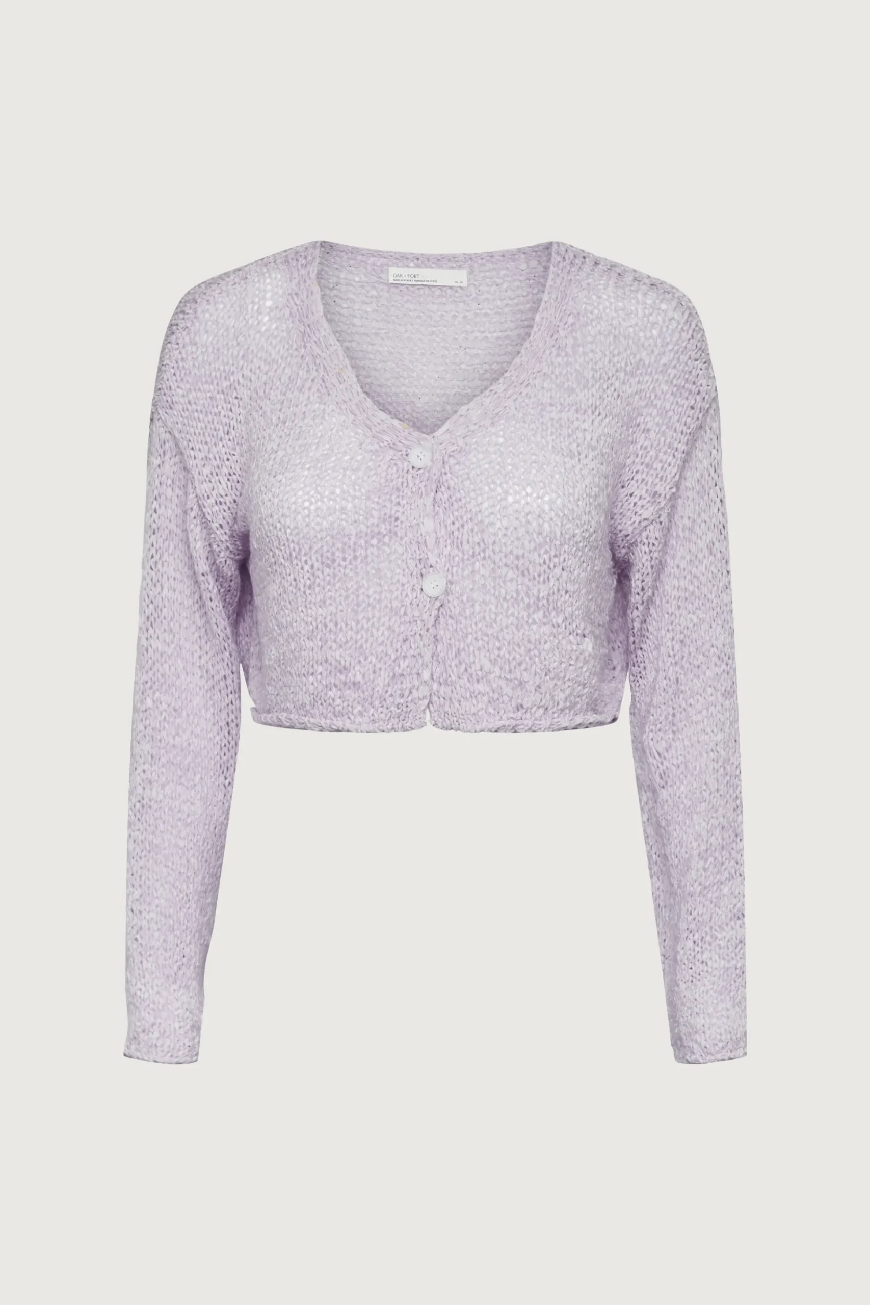 Long sleeve. V-neck. Crochet. Buttons. Cropped.