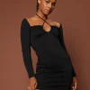 Slim fit. Mini length. Long sleeves. Halter design with ties. 34.25″ length based on size S.