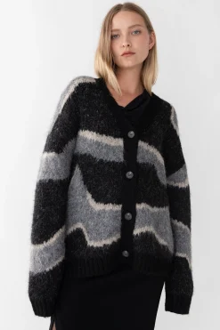 Intarsia knit. Button front. Dropped shoulders. Ribbed trims.