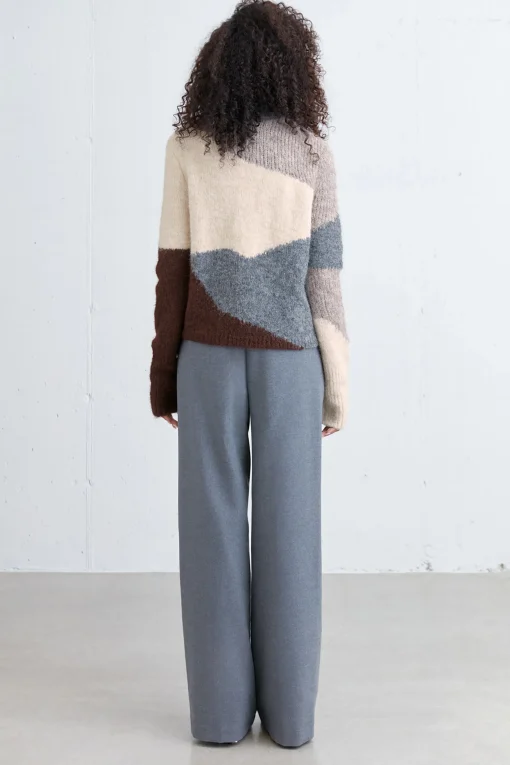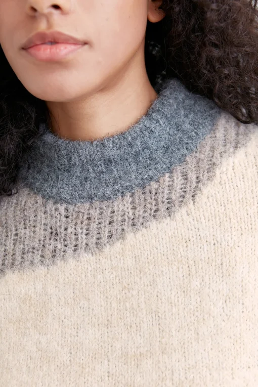 Relaxed fit. Cropped length. High neckline. Intarsia knit. 20″ length based on size S.