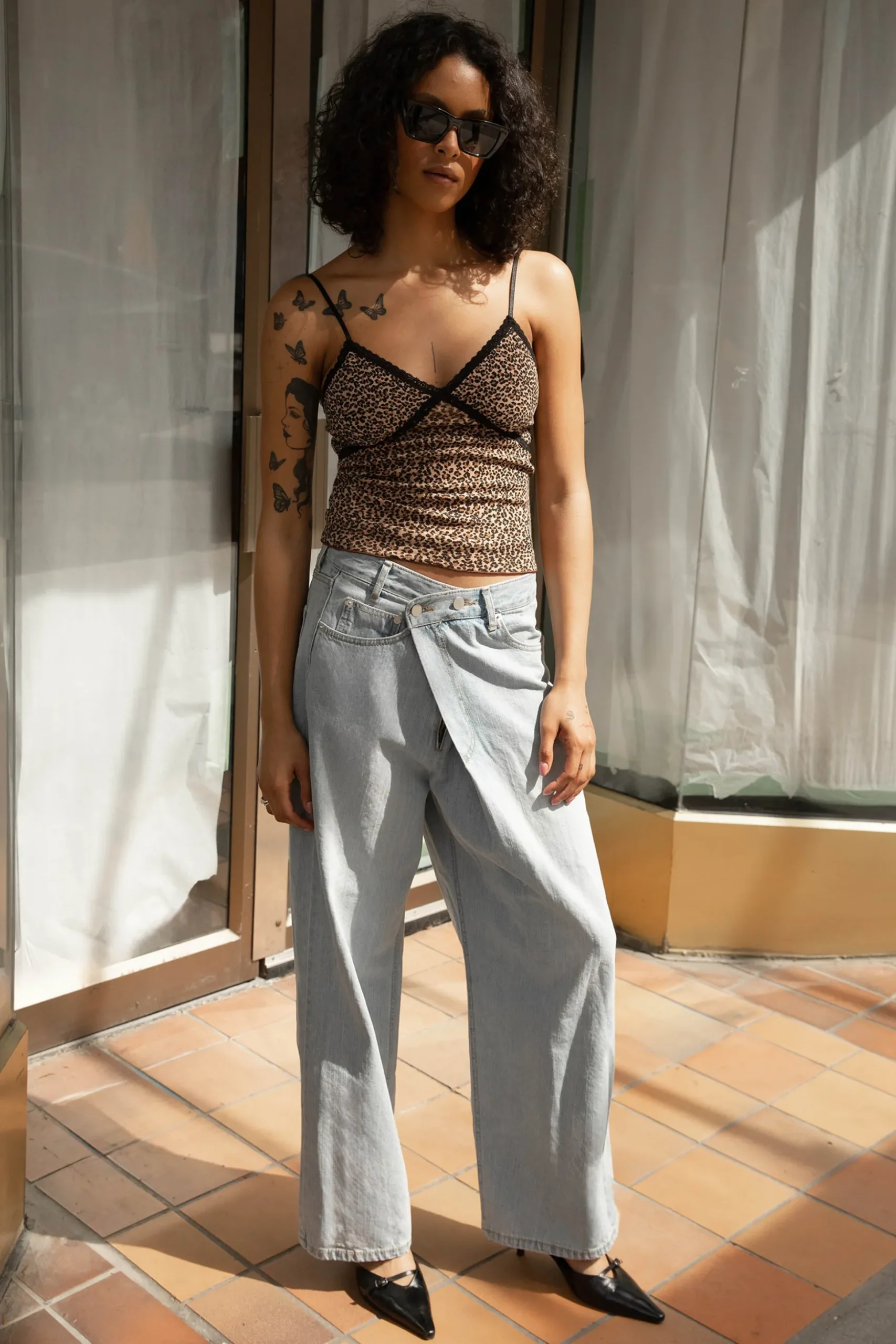 This tank top features a leopard print with lace trim and a scalloped hem. Wear yours this summer with shorts or a skirt.