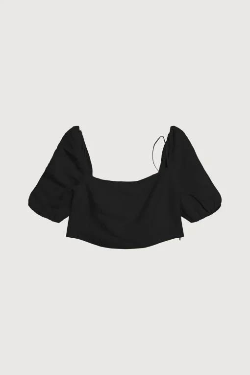 Classic fit. Cropped length. Square neckline. Puff sleeves. Smocked back. Side zipper. 9.5″ length based on size S.
