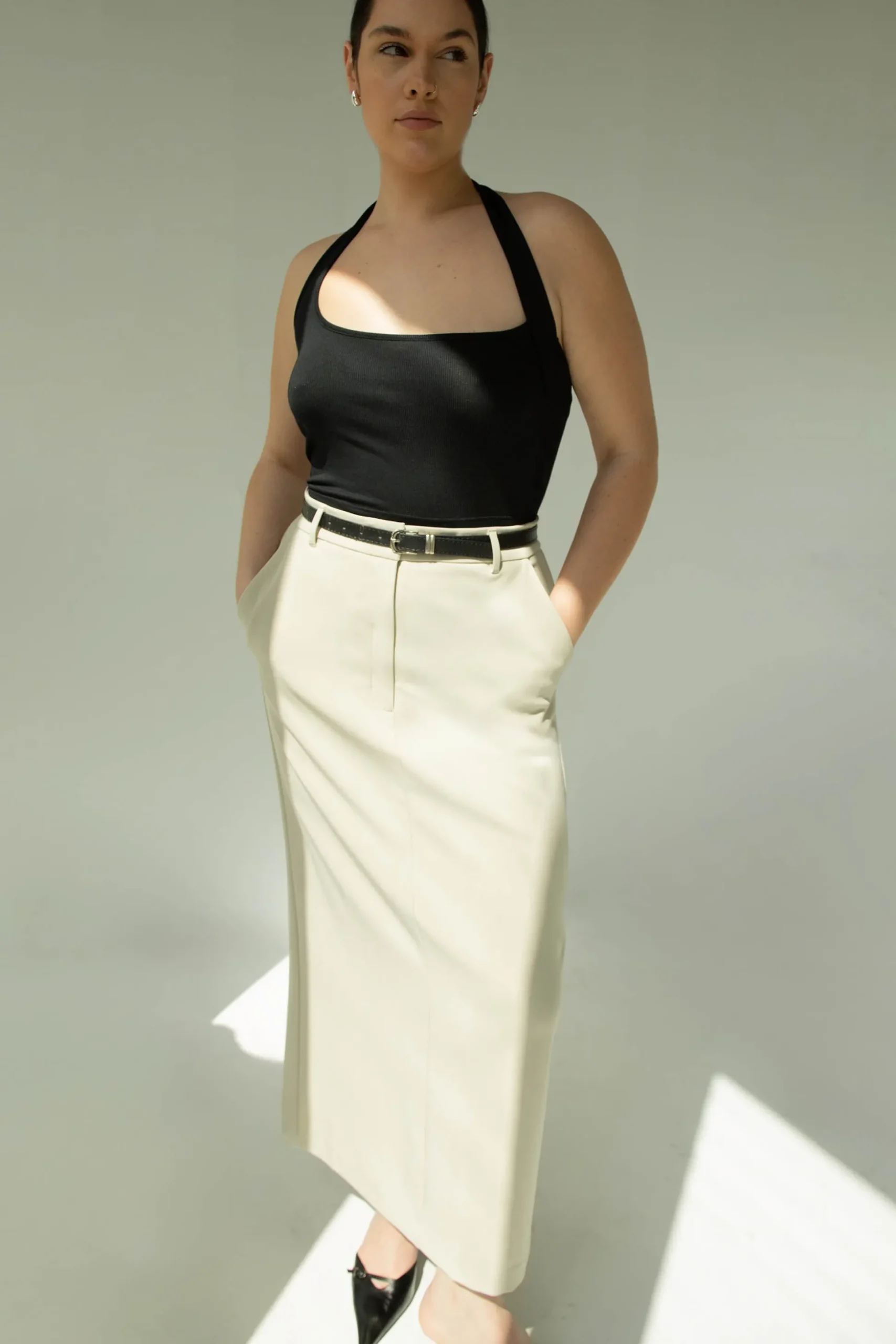 This maxi suiting skirt is cut from recycled materials that is GRS certified —a climate-friendly approach to production which reduces the harmful impact on environment. It has a relaxed fit with a high-rise waist with belt loops and side pockets. Wear it as a set with the Suiting Tube Top (WT-12484-W).