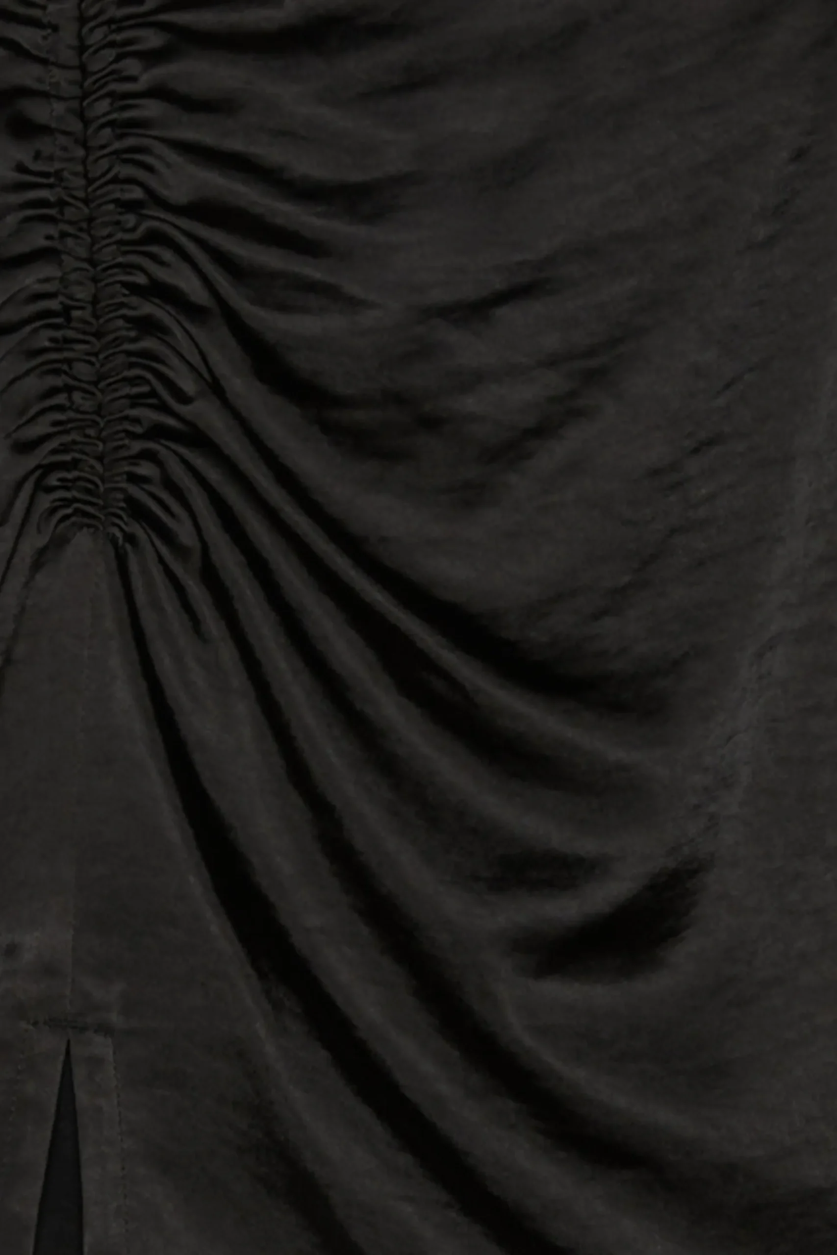 This mini satin skirt sits high on the waist and is detailed with a gathered front with a slit. An easy styling piece to wear with any outfits, wear yours with a wrap top and platform heels.