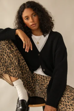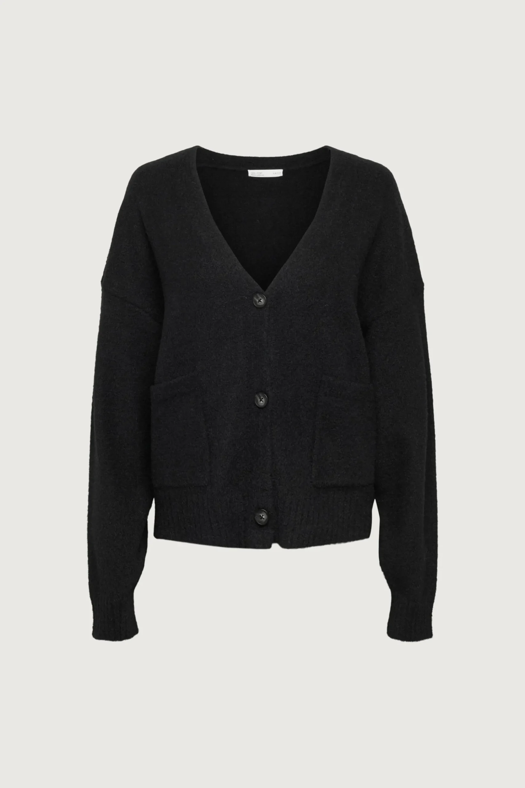This oversized cardigan is spun from a fuzzy textured yarn and is detailed with dropped shoulders, large buttons, ribbed trims and front patch pockets. A cozy knit to wear with any look from satin dresses to twill pants.