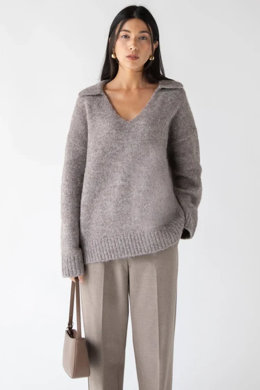 This oversized V-neck sweater is detailed with a collared neckline, dropped shoulders and ribbed trims. Start off the new season with a cozy knitwear choice that is versatile enough for any outfit. Style yours with a mini pleated suiting skirt or high-rise trousers.