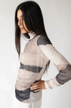 Sheer mesh patterned dress. High neckline. Ruched side detail.