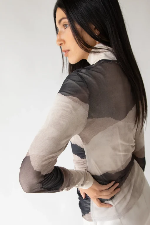 This sheer mesh patterned long sleeve top is made in a body-hugging silhouette to easily layer over a fitted tank or just a lace bralette. Style yours with a bralette and high-rise trousers under a vegan leather bomber.