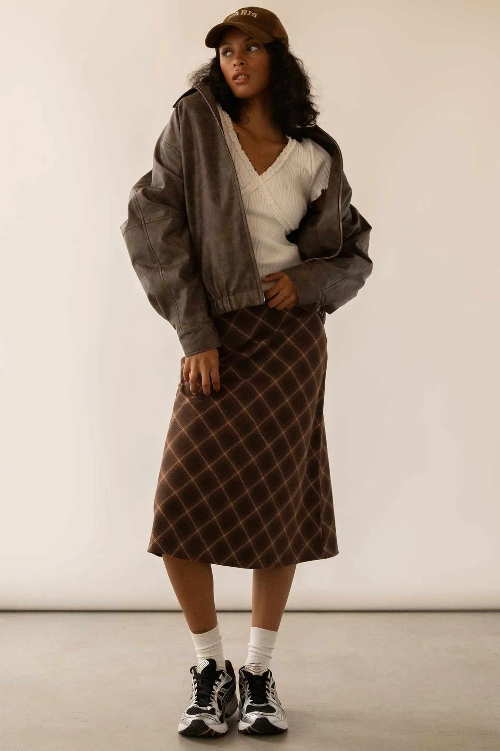 This midi plaid skirt is made from a double sided brushed fabric in a relaxed fit. It has a mid-rise waist and a subtle A-line shape. Wear yours with a cropped tee or the matching Plaid Shirt (WT-13180-W).