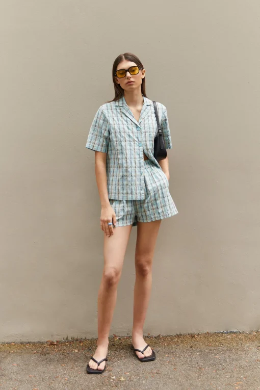 Relaxed fit. Short sleeves. Notched lapels. Plaid seersucker fabric. Front patch pocket.