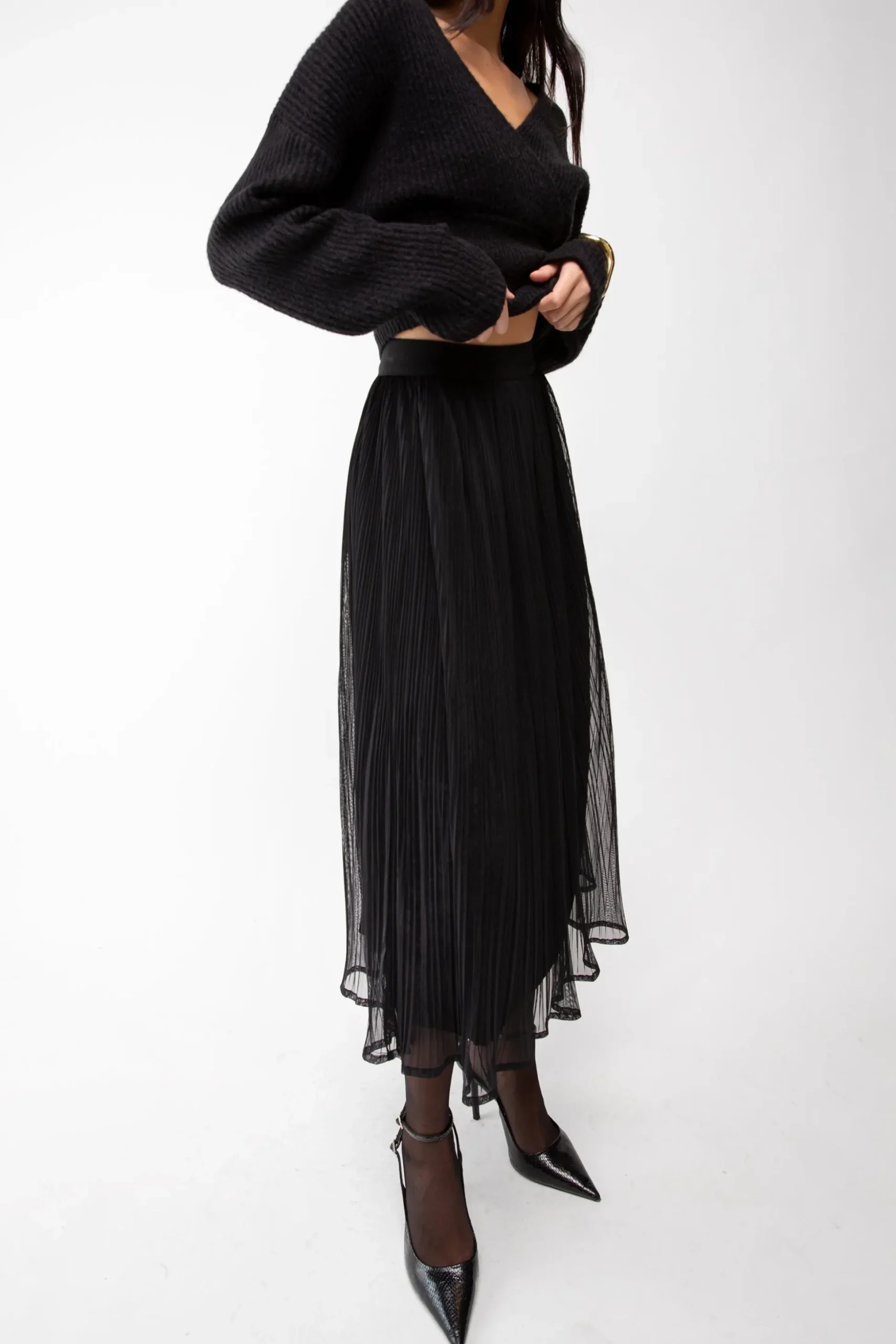 This maxi length skirt features a velvet-like layer with a sheer pleated fabric on top. Wear it casually with a cozy sweater, or dress it up.