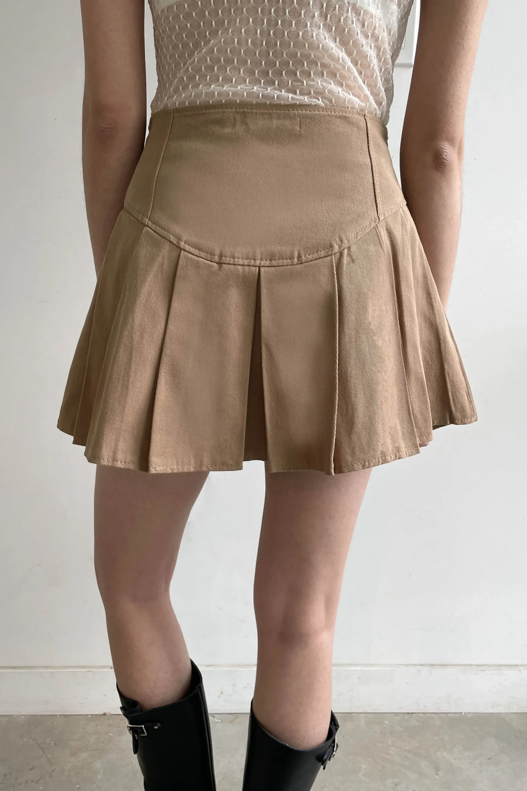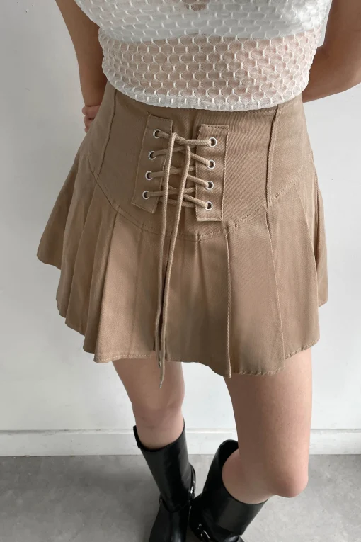 This twill pleated mini skirt features a corset-style front tie detail. Wear yours with a simple tank or dress it up with a blouse.