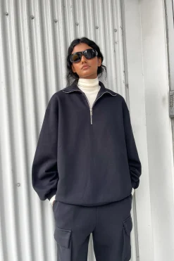 Oversized fit. Quarter zip front. Dropped shoulders. Elasticated trims. Dropped shoulders. 26.5″ length based on size S.