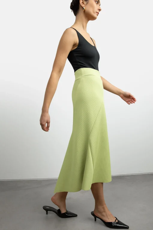 Midi length. Abstract hemline. Ribbed fabric. Elastic waistband.