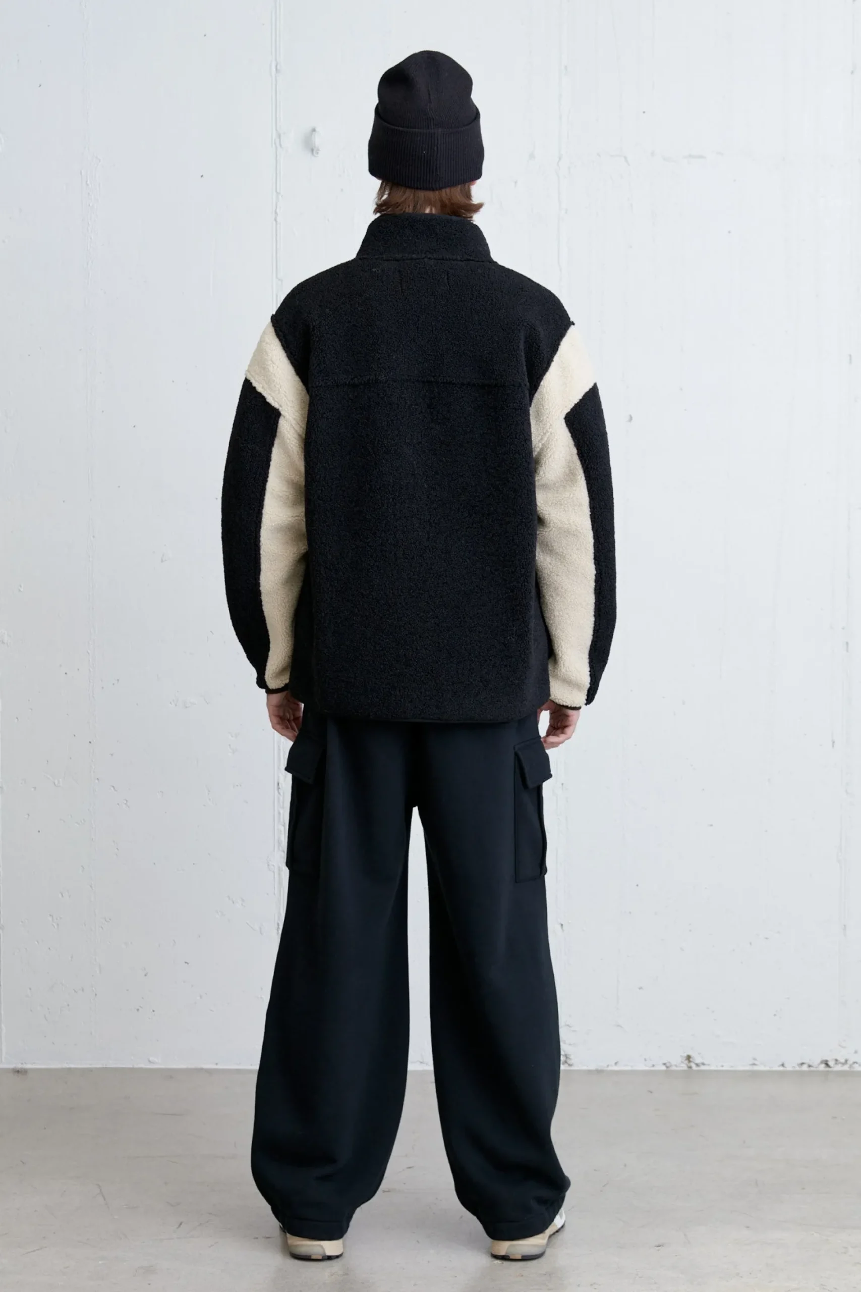 Relaxed fit. High neckline. Zipper front. Multiple front pockets. Contrast shoulders and sleeve panels. Sherpa texture. 29″ length based on size M.