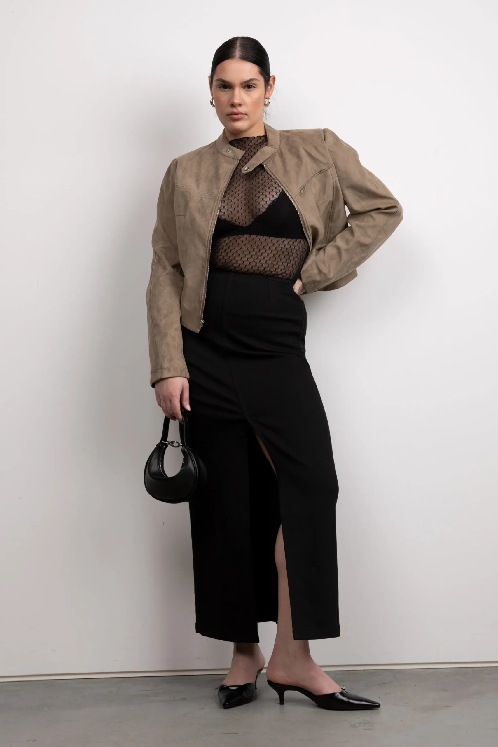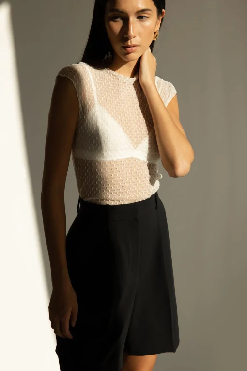 This sleeveless fitted top is made from a dotted mesh fabric finished with ruffled trims. Add texture to your wardrobe this season with this piece. Pair it with a midi skirt and heeled mules to go with it.