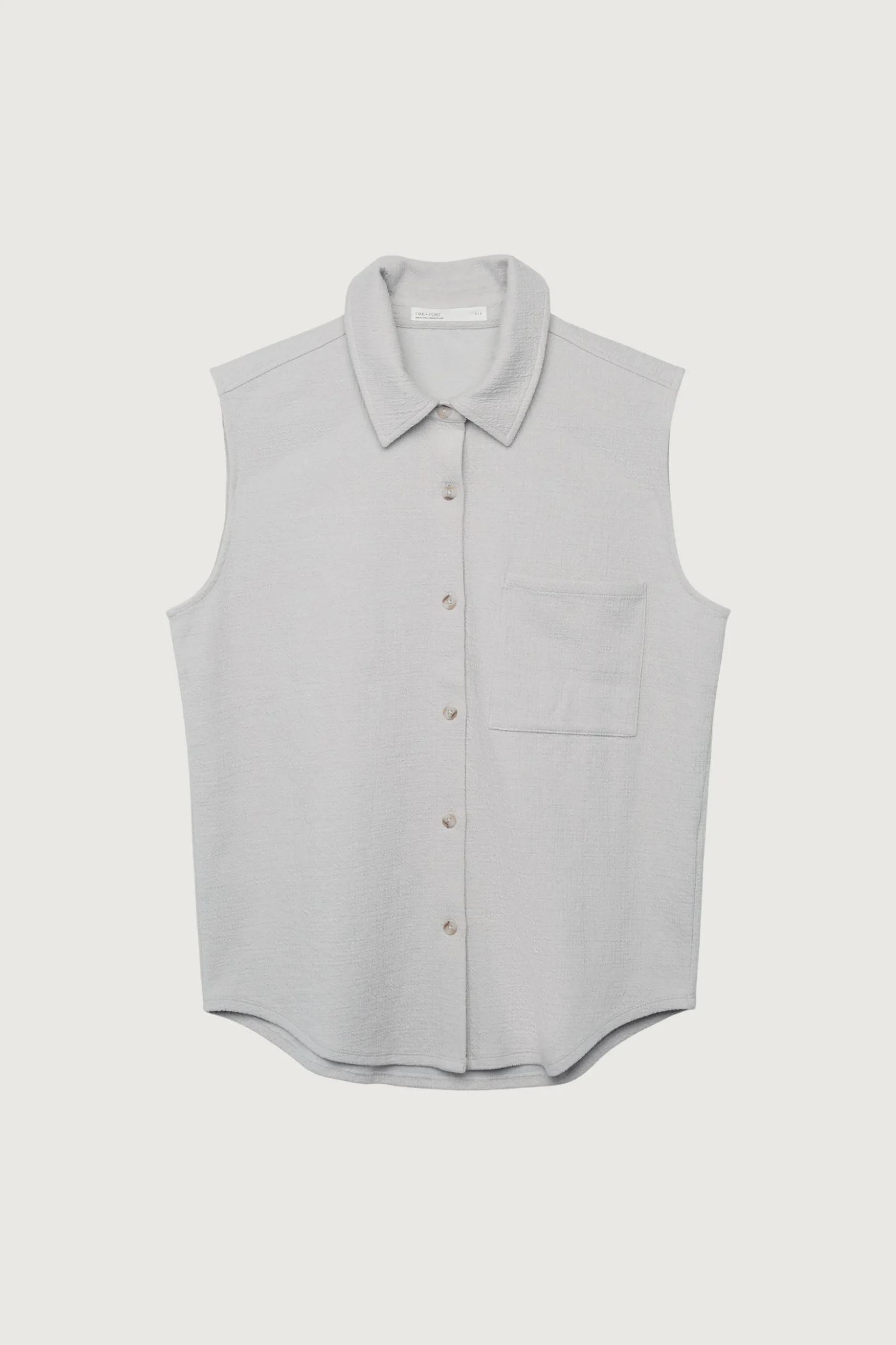 Textured fabric. Collared neckline. Button front. Front patch pocket.