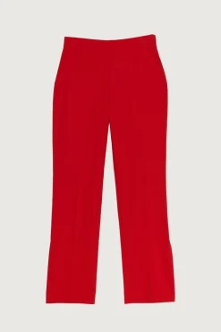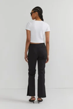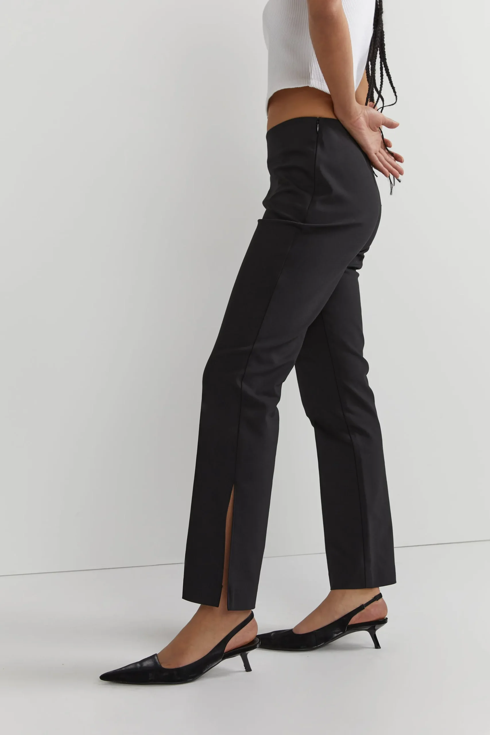 Slim fit. High-rise, inner elasticated waist. Side zipper. Side slit at hem. 30″ inseam.