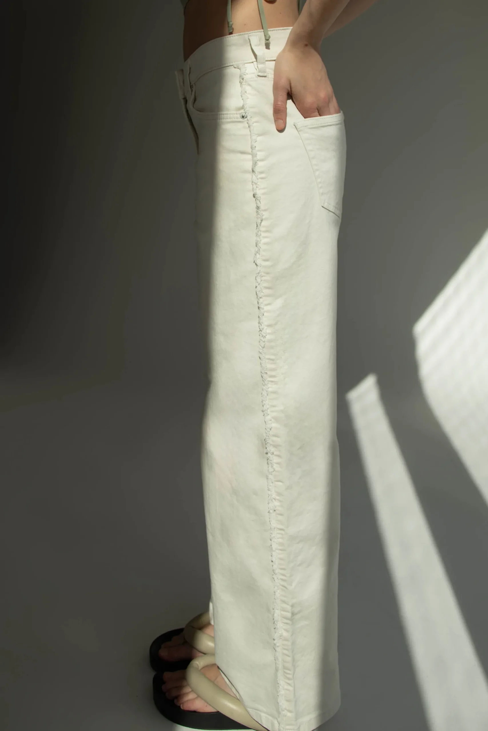Stretch cotton twill. 5-pocket design. Frayed sides.
