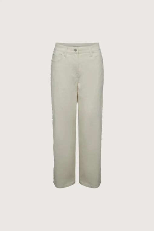 These straight leg twill pants are made in a relaxed fit and has a mid-rise waist. It has a 5-pocket design and is detailed with fraying on the sides. Pair yours with a lightweight knit and heels.