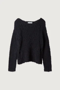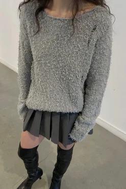 This textured sweater is made in a relaxed fit and has a wide neckline and distressing details. A cozy knit to layer over mockneck tops or basic tees.