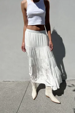 This multiple tiered maxi skirt is made with an elastic waistband. Style this flowy skirt with a more fitted top.