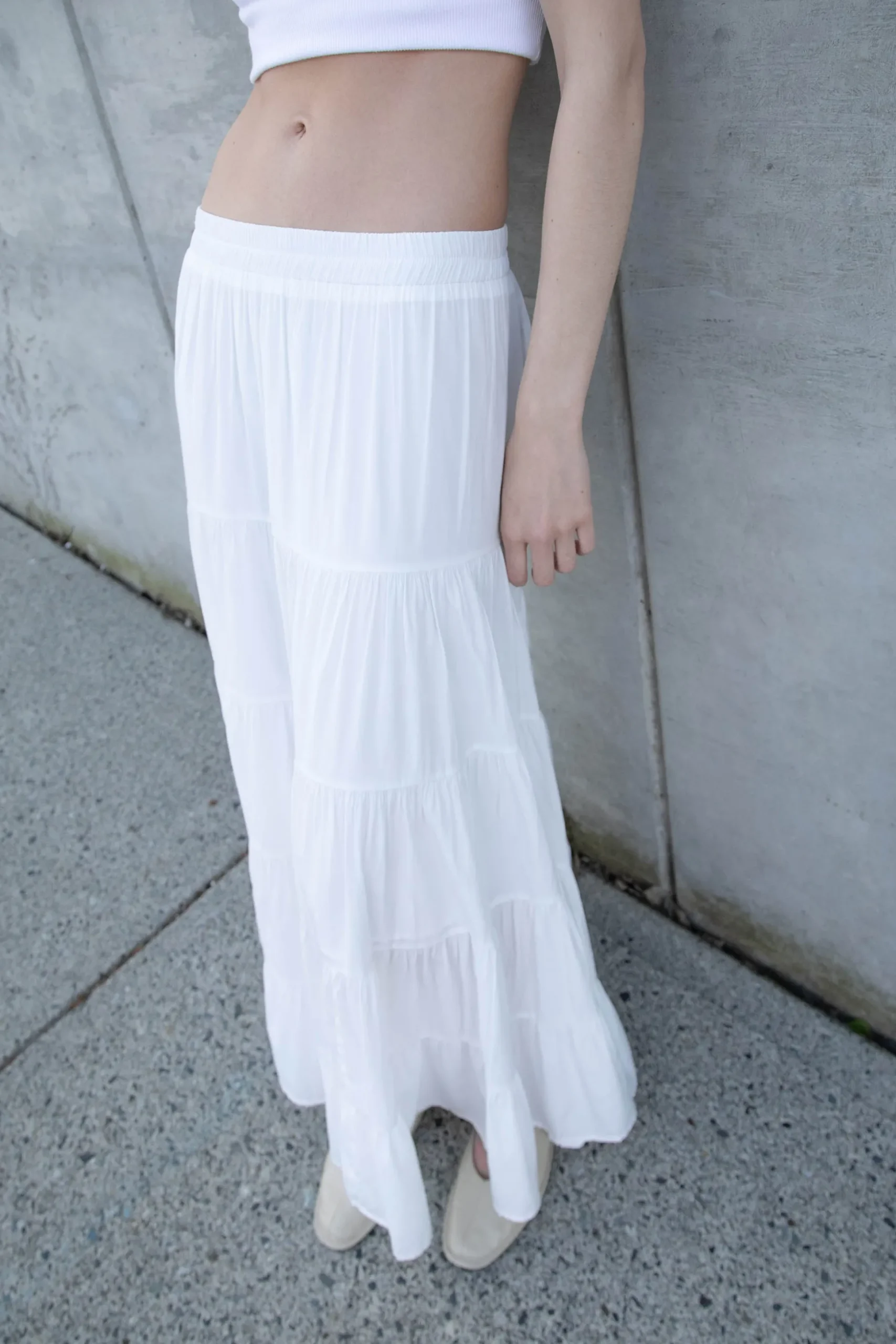 Maxi skirt. Tiered. Elastic waistband. 36.5″ length based on size S.